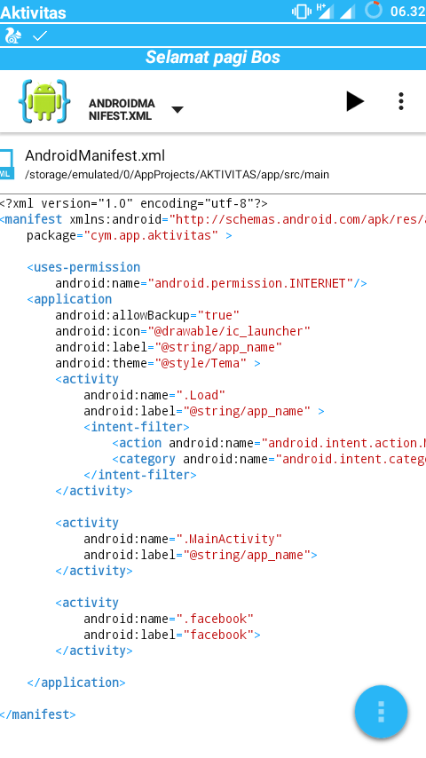 - Buka AndroidManifest.xml, maka akan tampil script seperti ini: