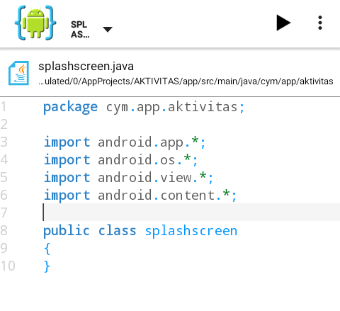 import android.view.*;Tambahkan dibawah package(cym.app.aktivitas;).Maka hasilnya seperti ini: