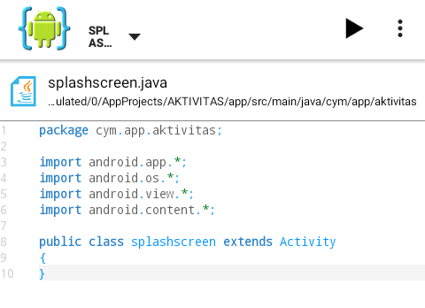 - Kemudian ubah “public class splashscreen” menjadi “public class splashscreen extends Activity”.Sehingga menjadi seperti ini: