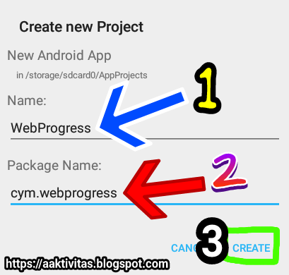 - Buka aplikasi Aide, kemudian pilih bagian “For Expert”, selanjutnya dibagian “Create New Project” pilih “New Android App”, maka akan muncul dialog window baru yang berfungsi untuk menentukan nama dan package/paket dari aplikasi tersebut.Dibagian nama, anda isikan nama aplikasi yang akan anda buat(misalnya: WebProgress ), dan dibagian package/paket anda isikan: cym.webprogress .Setelah anda isikan kedua bagian tersebut, selanjutnya anda tekan tombol “Create”.Jika masih bingung anda dapat lihat gambar berikut: