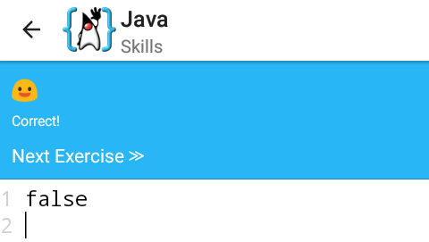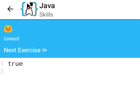 - Selanjutnya anda tekan tombol “Next Exercise”, maka anda disuruh untuk memprint outkan/menampilkan nilai kebenaran(true atau false) dari 10!=20 (10 tidak sama dengan 20). Untuk mengetahui hasil tersebut maka anda tambahkan 10!=20 , tambahkan kedalam script System.out.println(); , maka scriptnya menjadi seperti ini: