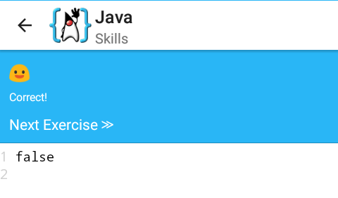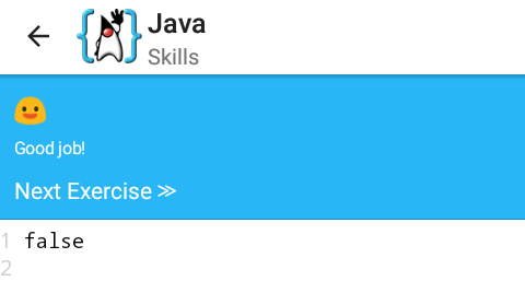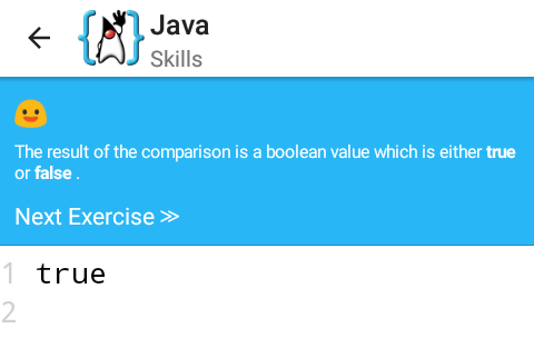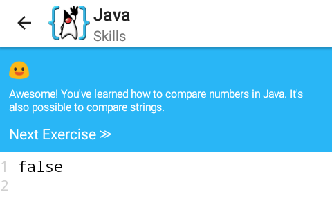 - Kemudian anda klik tombol “Next Exercise”, maka ditahap ini anda disuruh untuk memprint outkan/menampilkan nilai kebenaran(true atau false) dari 10==20 (10 sama dengan 20) .Untuk mengetahui hasil tersebut maka tambahkan 10==20 , tambahkan ke dalam script System.out.println(); , maka scriptnya menjadi seperti ini: