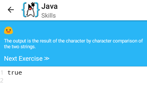 - Kemudian anda tekan tombol “Next Exercise”, maka anda disuruh untuk memprint outkan/menampilkan nilai kebenaran(true atau false) dari “hello”.equals(“hi”) (hello sama dengan hi).Untuk mengetahui hasil tersebut maka anda tambahkan “hello”. equals(“hi”) , tambahkan kedalam script System.out.println(); , maka scriptnya menjadi seperti ini: