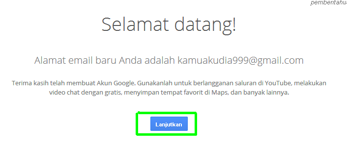 - Dan taraa…, anda telah berhasil membuat akun google baru anda, dan muncul gambar seperti dibawah ini, kemudian klik tombol “Lanjutkan“.