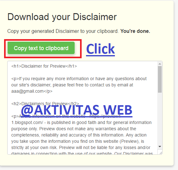 - Selanjutnya akan muncul hasil Disclaimer untuk web atau blog anda, copy kan disclaimer tersebut. (Lihat gambar dibawah)