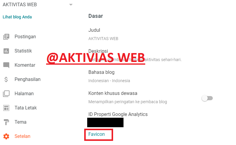 - Selanjutnya lihat dibagian Setelan Dasar ada link Favicon, kemudian klik link tersebut.