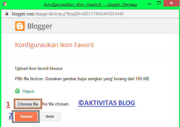 (Perlu diingat disini, untuk gambar Favicon yang disarankan harus berbentuk bujur sangkar (maksudnya panjang dan lebarnya haruslah sama), dan berukuran maksimal 99 Kb.). Setelah anda pilih gambarnya kemudian klik Simpan.